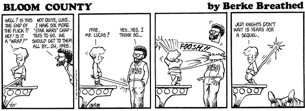 This cartoon was originally published on July 15, 1983. Notice that Lucas says that the prequels should begin in ’98, Berke Breathed only missed it by one year! Not bad. Click on the picture to see the rest of the cartoon. Luke Binkleywalker is not happy about having to wait that long. Imagine how he would have felt had Lucas also told him about Jar Jar and the whining Anakin!